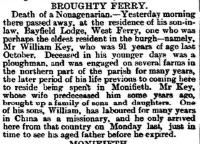 ; 1899 deaths in the district of St Andrew in the burgh of Dundee, William Key farm grieve widower of Elizabeth Myres, 1899 April twelfth 9h 10m am Bayfield Lodge West Ferry parish of Dundee, m, 91 years, parents George Key estate joiner (dec) and Isobel Key ms Law (dec), cystitis chronic exhaustion as cert by James Gowans MBCM, William Key son 17 Park Avenue Dundee; registered 1899 April 13th at Dundee Jas Murray registrar.11 - (Witness) Newspaper Article: Elisabeth Myers servant and David McDonald and William Key missionary was mentioned in a newspaper article about William Key farm servant on 13 April 1899. Broughty Ferry - Death of a Nonagerian. - Yesterday morning there passed away at the residence of his son-in-law, Bayfield Lodge, West Ferry, one who was perhaps the oldest resident in the burgh - namely, Mr William Key, who was 91 years of age last October. Deceased in his younger days was a ploughman, and was engaged on several farms in the northern part of the parish for many years, the later period of his life previous to coming here to reside being spent in Monifieth. Mr Key, whose wife predeceased him some years ago, brought up a family of sons and daughters. One of his sons, William, has laboured for many years in China as a missionary, and he only arrived here from that country on Monday last, just in time to see his aged father before he expired.12