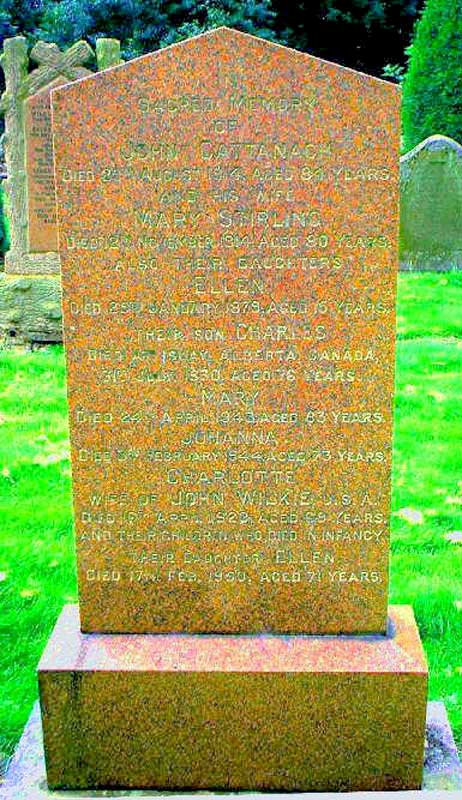 Stone in Dunnichen Churchyard reads : in sacred memory of John Cattanch died 29th August 1914 aged 84 years and his wife Mary Stirling died 12th November 1914 aged 80 years. Also their daughter Ellen died 25th January 1879 aged 15 years, their son Charles died at Islay, Alberta, Canada 31st July 1950 aged 75 years, Mary died 24th April 1943 aged 83 years, Johanna died 3rd February 1944 aged 73 years, Charlotte wife of John Wilkie, I.S.A died 16th April 1923 aged 68 years and their children who died in infancy. Their daughter Ellen