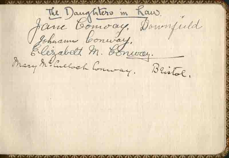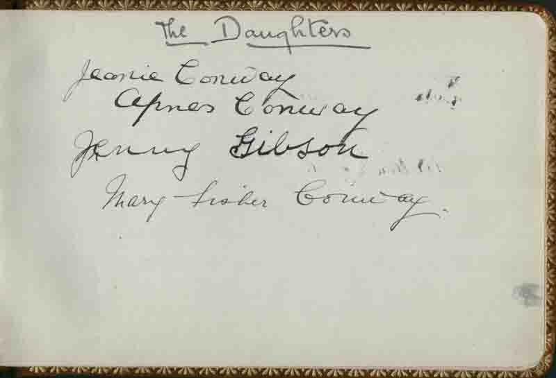 - [S4] James Conway - Agnes McKenzie Fisher, Autograph Book, 7 Jun 1911 & 1921, PC Carson, 2 Gillburn Road, Dundee, Scotland, Golden Wedding & Diamond Wedding Autograph Book.