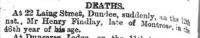 ; John Findlay spirit dealer married to Elizabeth McDougall prev to Catherine Laing 1872 April 17th 7h 30m am 52 Murraygate Dundee, m, 64 years, fath John Findlay fisherman (dec), moth Janet Findlay ms Menmuir (dec), apoplexy about 30 hours as cert by J H Miller MD, inf Henry Findlay son present 22 Laing Street, reg 1872 April 17th at Dundee David Scott registrar.4 - Announcement*: Henry Findlay flaxdresser Deaths: at 22 Laing Street, Dundee, suddenly, on the 12th inst., Mr Henry Findlay, late of Montrose, in the 46th year of his age. on 15 June 1875.5,6